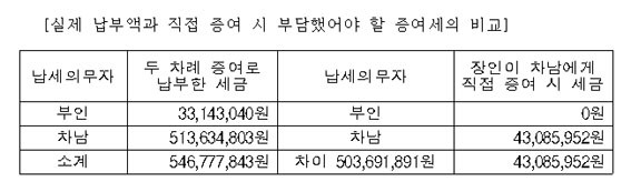 | | ¨Ï ¿Â¾ç½Å¹® | | ¼¼¹« Àü¹®°¡µéÀº ¼¼±ÝÀ» ÁÙÀ̱â À§ÇÑ ¹æ¹ýÀ¸·Î Á¶ºÎ¸ð°¡ ¼ÕÀÚ¿¡°Ô Á÷Á¢ Àç»êÀ» Áõ¿©(ÀÏ¸í ¡®¼¼´ë »ý·« Áõ¿©¡¯)ÇÏ´Â °ÍÀ» ±Ç°íÇϰí ÀÖ´À³ª Èĺ¸ÀÚÀÇ ºÎÀÎ ¹× Â÷³²Àº Áõ¿©¼¼(Ãëµæ¼¼¿Í µî·Ï¼¼ µîÀº Á¦¿Ü)·Î 5¾ï4õ600¸¸¿øÀ» ³³ºÎÇØ ÀåÀÎÀÌ Á÷Á¢ Â÷³²¿¡°Ô Áõ¿©ÇÏ¿´À» °æ¿ì ºÎ´ãÇß¾î¾ß ÇÒ Áõ¿©¼¼ 4õ300¸¸¿ø(3õ300¸¸¿ø¿¡ ¼¼´ë »ý·« »ó¼Ó ½Ã ÇÒÁõÀ² 30%¸¦ °¡»êÇÑ ±Ý¾×)º¸´Ù 5¾ï300¸¸¿øÀ» ´õ ³³ºÎÇßÀ½À» ¼³¸íÇß´Ù.