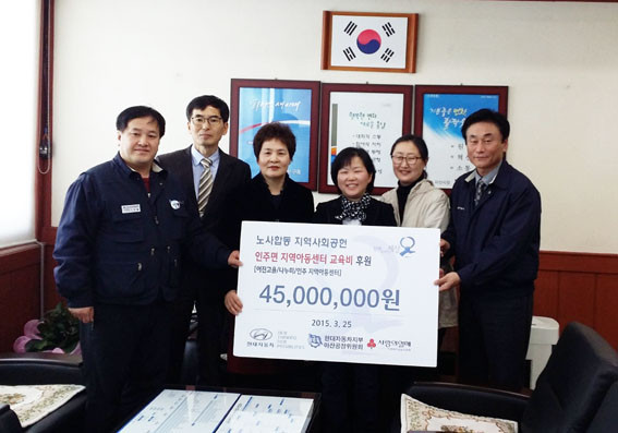 À̳¯ Àü´ÞÇÑ ÈÄ¿ø±ÝÀº ÃÑ 4õ500¸¸ ¿øÀ¸·Î Çö´ëÀÚµ¿Â÷ ³ë»çÇÕµ¿±â±Ý¿¡¼ ¸¶·ÃµÆÀ¸¸ç ÀÎÁÖ¸é 3°³ Áö¿ª¾Æµ¿¼¾ÅÍ(¾îÁø°íÀ»Áö¿ª¾Æµ¿¼¾ÅÍ, ³ª´©¹ÌÁö¿ª¾Æµ¿¼¾ÅÍ, ÀÎÁÖÁö¿ª¾Æµ¿¼¾ÅÍ)¿¡ Àü´Þ ÈÄ ±³À°ºñ·Î »ç¿ëµÉ ¿¹Á¤ÀÌ´Ù.