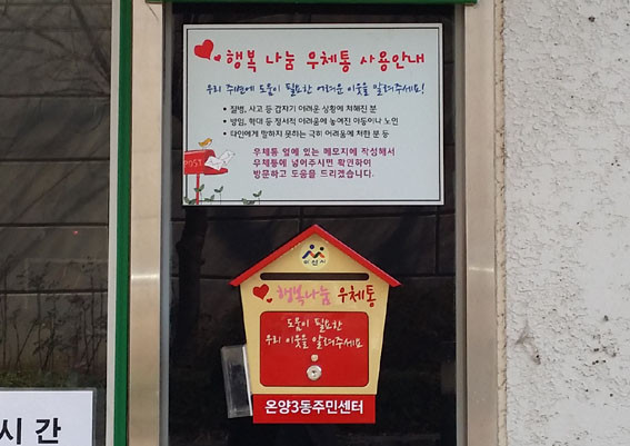 ¡®Çູ³ª´® ¿ìüÅ롯Àº ÁÖ¹ÎÀÇ °íÃæÀ» Á÷Á¢ µè´Â ¸Å°³Ã¼·Î Áúº´, »ç°í µîÀ¸·Î °©Àڱ⠾î·Á¿ò¿¡ Ã³ÇØÁö°Å³ª, ŸÀο¡°Ô ¸»ÇÒ ¼ö ¾ø´Â ¾î·Á¿ò¿¡ óÇÑ °ü³» ÁÖ¹ÎÀÌ ¸Þ¸ð¸¦ ÀÛ¼ºÇØ ¿ìüÅë¿¡ ³ÖÀ¸¸é ´ã´ç Á÷¿øÀÌ °íÃæÀ» È®ÀÎ ÈÄ ÇØ´ç ÁÖ¹ÎÀ» Á÷Á¢ ¹æ¹®ÇØ ÀûÀýÇÏ°í ºü¸¥ º¹Áö¼ºñ½º¸¦ Á¦°øÇÏ´Â ÇàÁ¤¼ºñ½º·Î Áö³ÇØ 12¿ù Ãæ³² ÃÖÃÊ·Î ¼³Ä¡ ¿î¿µ ÁßÀÌ´Ù.