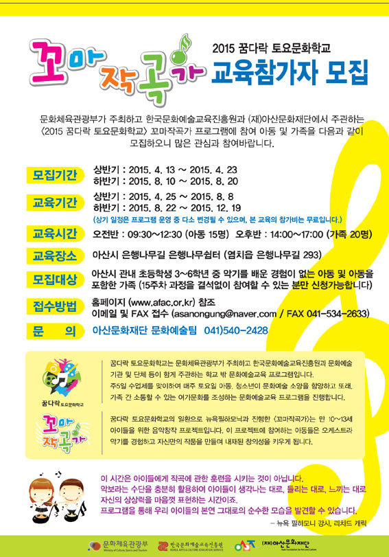 2015 ²Þ´Ù¶ô Åä¿ä¹®ÈÇб³ ²¿¸¶ÀÛ°î°¡ ¾Æµ¿ ¹× °¡Á· ¸ðÁý°ø°í´Â ¾Æ»ê¹®ÈÀç´Ü ȨÆäÀÌÁö(http://www.afac.or.kr)¿¡¼ È®ÀÎ ÇÒ ¼ö ÀÖ´Ù.