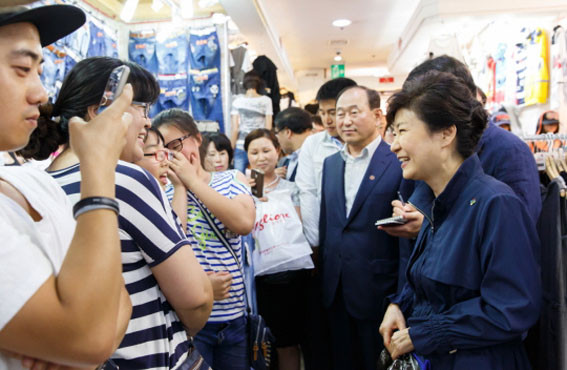 ¹Ú±ÙÇý ´ëÅë·ÉÀº 6¿ù 14ÀÏ ¿ÀÈÄ ¸Þ¸£½º »çÅÂ·Î ÇØ¿Ü°ü±¤°´ ±Þ°¨, ±¹³»¼Òºñ À§Ãà µîÀ¸·Î Å« ¾î·Á¿òÀ» °Þ°í ÀÖ´Â ¡®µ¿´ë¹® »óÁ¡°¡¡¯¸¦ ¹æ¹®ÇØ »óÀεéÀ» À§·ÎÇÏ°í ¹Î»ýÇöÀåÀ» µÑ·¯º¸¾Ò´Ù.