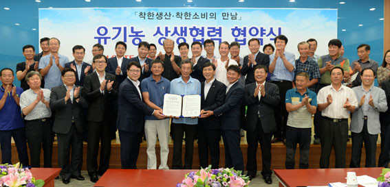 Ãæ³²µµ°¡ µµ³»¿¡¼ »ý»êµÇ´Â À¯±â³ó»ê¹°ÀÇ ÆÇ·Î¸¦ ³ÐÈ÷±â À§ÇØ ·Ôµ¥½´ÆÛ, Ãæ³²Ä£È¯°æ³ó¾÷Àο¬ÇÕȸ¿Í ¼ÕÀ» ¸ÂÀâ¾Ò´Ù.