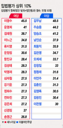 À̹ø ÀÔ¹ýȰµ¿ Æò°¡´Â ¹ý¾È¹ßÀÇ °Ç¼ö¿Í ¹ý¾ÈÅë°ú °Ç¼ö¸¦ ÇÕ»êÇÏ¿© ÀÌ·ç¾îÁ³À¸¸ç, À̸í¼ö ÀÇ¿øÀº °¢°¢ 25Á¡ ¸¸Á¡ÀÎ ¹ý¾È¹ßÀÇ ºÎ¹®¿¡¼ 25Á¡, ¹ý¾ÈÅë°ú ºÎ¹®¿¡¼ 20.5Á¡À» ±â·Ï ÇÑ °ÍÀ¸·Î º¸µµµÆ´Ù.