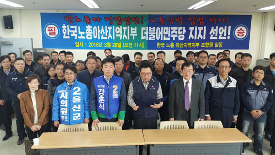 28ÀÏ ÁøÇàµÈ ±âÀÚȸ°ß¿¡´Â Çѱ¹³ëÃÑ ¾Æ»êÁö¿ªÁöºÎ °ÈïÁø ÀÇÀå, ÀÌ¿ëµæ Àü Çѱ¹³ëÃÑ À§¿øÀå, À̼®Çà Àü ¹ÎÁÖ³ëÃÑ À§¿øÀå, Çѱ¹³ëÃÑ ¾Æ»êÁö¿ªÁöºÎ ´ëÀÇ¿øµé ¹× ³ëµ¿°è °ü°èÀÚµéÀÌ Âü¼®ÇØ °ÈÆ½Ä Èĺ¸¿¡ ´ëÇÑ ÁöÁö¸¦ Ç¥¸íÇß´Ù.