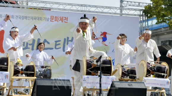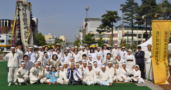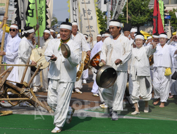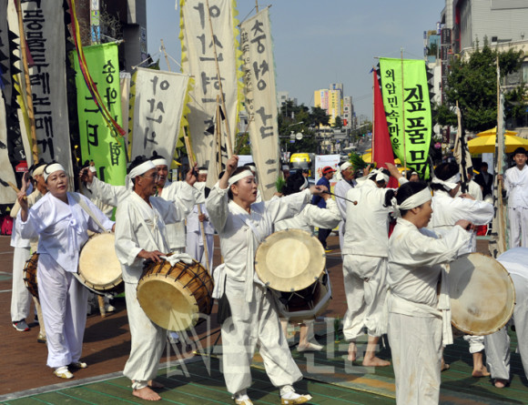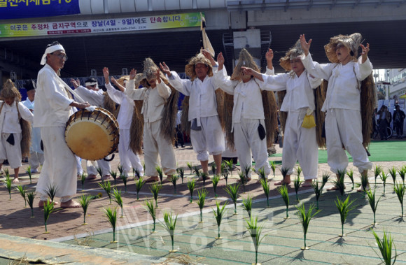 ¶ÏÇ®·Î ¸¸µç µµ·©ÀÌ¿Í ¿ì¸ð¸¦ Âø¿ëÇÑ ³ó¹ÎµéÀÌ ±½°í Åõ¹ÚÇÑ ±Â°Å¸®Àå´Ü¿¡ ¼Û¾ÇµÎ·¹³ó¿ä¸¦ ºÎ¸£¸ç °ø¿¬ÀÌ ½ÃÀ۵ȴÙ. dz¿ä¸¦ ±â¿øÇÏ´Â ³ó½ÅÁ¦¸¦ Áö³»¸é¼ ³ó»çÁþ´Â µ¿¾ÈÀÇ ¼ö°í¿Í ÇǷθ¦ ÇѹÙÅÁ dz¹°Àå´Ü¿¡ ¸ÂÃç Ç®¾î³»´Â °ÉÂßÇÑ ÀÔ´ãÀ¸·Î °ü°´À» »ç·ÎÀâ´Â ¹«´ë¿¡ °ü°´µéÀÌ ¹è¸¦ Àâ°í ¿ô´Â´Ù.