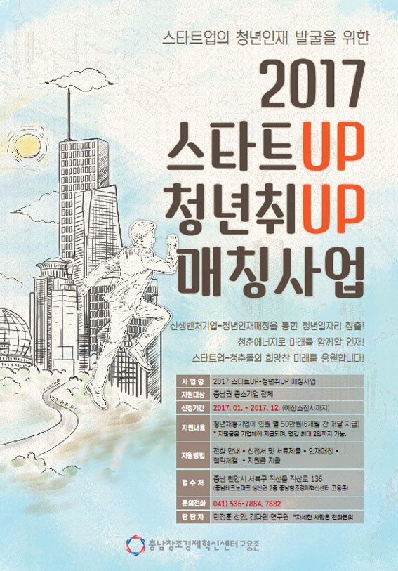 Ãæ³²Ã¢Á¶°æÁ¦Çõ½Å¼¾ÅÍÀÇ ¡®2017 ½ºÅ¸Æ®¾÷-û³âÃë¾÷ ¸ÅĪ»ç¾÷¡¯ Áö¿ø ¹× ³»¿ë¿¡ ´ëÇÑ ÀÚ¼¼ÇÑ »çÇ×Àº Ãæ³²¼¾ÅÍ(¢Ï 041-536-7884, ¹ÎÁ¤ÈÆ ¼±ÀÓ¿¬±¸¿ø)·Î ¹®ÀÇÇÏ¸é µÈ´Ù.