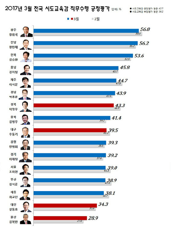 ¾Æ¿ï·¯ ±è ±³À°°¨Àº Áö¿ªÁֹεéÀÇ ÁöÁö¸¦ °¡Àå Å« ÆøÀ¸·Î È®´ëÇÑ ½Ãµµ ±³À°°¨ 1À§¸¦ Â÷ÁöÇß´Ù. ±èÁöö Ãþ³²±³À°°¨Àº Áö³ 2014³â 6¡¤4Áö¹æ¼±°Å¿¡¼ ÀÚ½ÅÀÌ ¾òÀº µæÇ¥À² 31.8%¿¡ ºñÇØ 14.0%p ´õ ³ôÀº 45.8%ÀÇ ÁöÁöÀ²·Î, 144.0Á¡ÀÇ ÁÖ¹ÎÁöÁöÈ®´ëÁö¼ö¸¦ ±â·ÏÇØ ÁöÁöÃþÀ» È®´ëÇÑ Á¤µµ°¡ °¡Àå Å« ½Ã¡¤µµ ±³À°°¨ 1À§¸¦ Â÷ÁöÇß´Ù. 2À§´Â À̼®¹® Á¦ÁÖ±³À°°¨, 3À§´Â ÀåÈÖ±¹ ±¤ÁÖ±³À°°¨À̾ú´Ù.