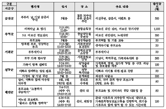 µµ °ü°èÀÚ´Â ¡°°¡Á¤ÀÇ ´ÞÀÎ 5¿ù, µµ³» °÷°÷¿¡¼ ¿¸®´Â °¡Á¤°ú ºÎ¸ð, ºÎºÎ °ü·Ã Çà»ç¿¡ °¡Á·°ú ÇÔ²² Âü°¡ÇØ °¡Á·ÀÇ ¼ÒÁßÇÔÀ» °¡½¿¿¡ ´Ù½Ã »õ±â´Â ¼ÒÁßÇÑ ±âȸ¸¦ ¸¸µé±â ¹Ù¶õ´Ù¡±¸ç µµ¹ÎµéÀÇ ¸¹Àº °ü½É°ú Âü¿©¸¦ ´çºÎÇß´Ù.