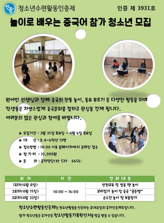 | | ¨Ï ¿Â¾ç½Å¹® | | ¾Æ»ê½Ãû¼Ò³â±³À°¹®È¼¾ÅÍ(°üÀå ³²»óÀÎ)ÀÌ ¿î¿µÇÏ´Â Áß±¹¹®ÈüÇè°ü °øÀÚÇдç(»êÇØ°ü)¿¡¼ Áß±¹¾î¿¡ ´ëÇÑ Èï¹Ì¸¦ À̲ø¾î³»°í ÀÚ¿¬½º·´°Ô Áß±¹¾î¸¦ ¸»ÇÒ ¼ö ÀÖ´Â ÀÎÁõÇÁ·Î±×·¥ ¡®³îÀÌ·Î ¹è¿ì´Â Áß±¹¾î¡¯ ÇÁ·Î±×·¥ Âü°¡ÀÚ¸¦ ¸ðÁýÇÑ´Ù.