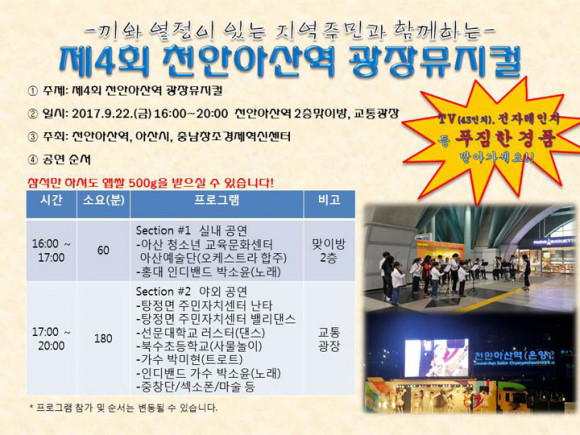 À̹ø Çà»ç´Â ¡®Ã£¾Æ°¡´Â ¹®È ¿¹¼ú °ø¿¬¡¯À» Å׸¶·Î õ¾È¾Æ»ê¿ªÀÌ ´Ü¼øÇÑ ±âÂ÷¿ªÀÇ ¿ªÇÒÀ» ³Ñ¾î, °í°´ ¹× Áö¿ª Áֹΰú ÇÔ²² Áñ±æ ¼ö ÀÖ´Â ¿ª Áß½ÉÀÇ ¹®È°ø¿¬ÀÇ ÀåÀ» ¸¸µé¾î Áö¿ª »çȸ¿Í »ó»ýÀÇ ±âƲÀ» ¸¶·ÃÇÏ¿´´Ù.