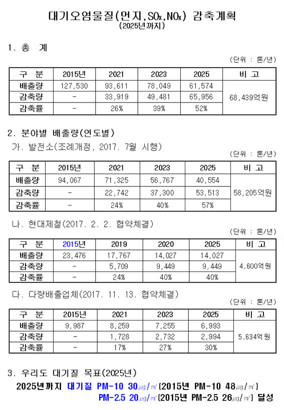 À̳¯ Çù¾àÀ» ¸ÎÀº ´ë±Ô¸ð ¹èÃâ»ç¾÷Àå°ú ¹ßÀü 4»ç, Çö´ëÁ¦Ã¶ µîÀÌ ´ë±â¿À¿°¹°Áú ¹èÃâ·®À» °èȹ´ë·Î ÁÙÀ̸é, 2025³â µµ³» ´ë±âÁúÀº ¹Ì¼¼¸ÕÁö(PM-10)ÀÇ °æ¿ì 30§¶/§©·Î, Ãʹ̼¼¸ÕÁö(PM-2.5)´Â 20§¶/§©·Î °³¼±ÀÌ ±â´ëµÈ´Ù.