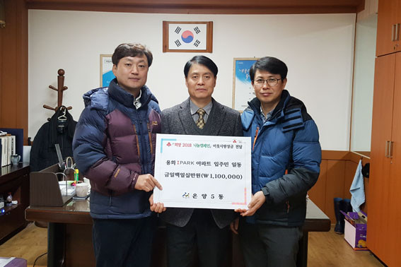 ¿ÀÁ¡±Ù ÀÔÁÖÀÚ´ëÇ¥´Â ¡°¸Å³â ¿¬¸»ÀÌ µÇ¸é ¿ì¸® ¾ÆÆÄÆ® ÀÔÁֹΠÀϵ¿Àº ¾î·Á¿î ÀÌ¿ôÀ» À§ÇØ ÀÌ¿ô»ç¶û ¼º±ÝÀ» Àü´ÞÇØ ¿Ô´Ù. ¿ÃÇØ´Â ¿©·¯ °¡Áö ¾È ÁÁÀº »ç°Çµé·Î ÀÎÇØ ¼º±Ý¸ð±Ý¾×ÀÌ ¿¹³âº¸´Ù ¸¹ÀÌ ÁÙ¾îµé°í ÀÖ´Ù°í ÃÖ±Ù ¾ð·Ð¿¡¼ Á¢Çߴµ¥ ¾ÈŸ±î¿î ¸¶À½ÀÌ´Ù.¡±¸ç, ¡°¸¹Àº ½Ã¹ÎµéÀÌ ¼º±Ý¸ð±Ý¿¡ ½Ê½ÃÀϹÝÀ¸·Î µ¿ÂüÇØ ³ª´®À¸·Î ÇູÇÑ ¼¼»óÀ» ¸¸µå´Âµ¥ ÀÛÀº µµ¿òÀÌ µÇ¾î ÁáÀ¸¸é ÁÁ°Ú´Ù. ¾ÕÀ¸·Îµµ °è¼Ó µ¿ÂüÇϰڴ١±°í ¸»Çß´Ù.