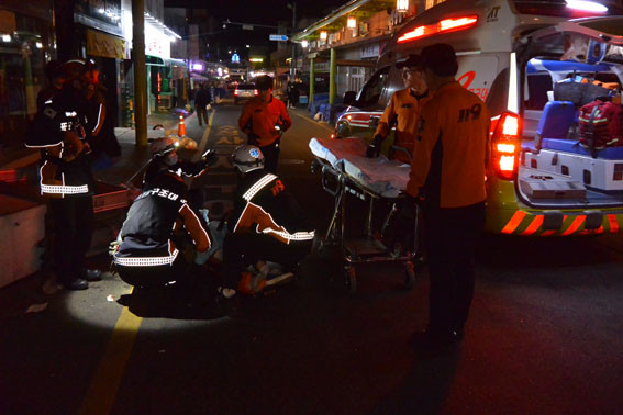 ¾Æ»ê°æÂû¼ ¿ÂõÁö±¸´ë(´ëÀå ¿À½ÂÇÐ °æ°¨)´Â ¼ú¿¡ ¸¸ÃëÇÑ Ã¤ ÆíÀÇÁ¡ ¾Õ¿¡ ÁÖÂ÷µÈ ¿µ¾÷¿ë Åýø¦ ÀýÃëÇØ µµÁÖ Áß Áö³ª°¡´ø ÇàÀÎ 3¸íÀ» Ãæ°Ý, Áß»óÀ» ÀÔÈù ÇÇÀÇÀÚ¸¦ ¹«ÀüûÃë¿Í µ¿½Ã¿¡ ½Å¼ÓÇÏ°Ô Ãâµ¿ÇØ ºÙÀâ¾Ò´Ù°í ¹àÇû´Ù.