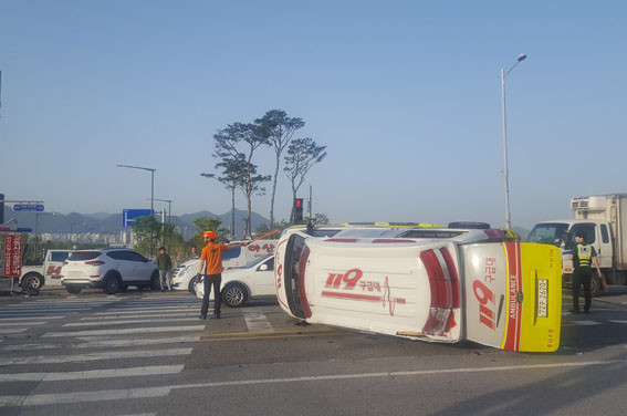 ¾Æ»ê¼Ò¹æ¼¿¡ µû¸£¸é 5¿ù 24ÀÏ ¿ÀÀü 6½Ã 11ºÐ °æ ÅÁÁ¤119¾ÈÀü¼¾ÅÍ ±¸±ÞÂ÷·®ÀÌ À½ºÀ¸é ¼ÒÀç ½ÉÁ¤Áö ÀǽÉȯÀÚ ½Å°í¸¦ ¹Þ°í ±¸±ÞÃ⵿ÇÏ´ø Áß, ÅÁÁ¤¸é Æ®¶óÆÓ¸®½º ¾Õ ±³Â÷·Î¿¡¼ ¼ºê(suv) Â÷·®°ú Ãæµ¹, ±¸±ÞÂ÷°¡ ÀüµµµÇ°í ½Â¿ëÂ÷ ¿îÀüÀÚ ¹× ±¸±Þ´ë¿øÀÌ ºÎ»óÀ» ´çÇß´Ù°í ¹àÇû´Ù.