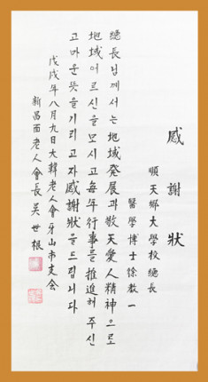 ¿À¼¼±Ù(çïá¦ÐÆ) ´ëÇѳëÀÎȸ ¾Æ»ê½ÃÁöȸ ½Åâ¸é³ëÀÎȸÀåÀÌ ¼±³ÀÏ ¼øÃµÇâ´ë ÃÑÀå¿¡°Ô Àü´ÞÇÏ°Ô µÉ °¨»çÀå Àü¹® ³»¿ëÀÌ´Ù. | ¨Ï ¿Â¾ç½Å¹® | ¼øÃµÇâ´ë°¡ ¸Å³â 8¿ù Ãʼø, ¡®¸»º¹¡¯¿¡ ÁîÀ½ÇØ Áö¿ª ¾î¸£½Å 250¿©¸íÀ» ´ëÇÐÀ¸·Î ¸ð¼Å¿Í °Ç°À» ±â¿øÇÏ´Â Çà»ç¸¦ ¿°í ÀüÅëÀ½½ÄÀÎ ¡®»ï°èÅÁ¡¯À» ¿ÀÂùÀ¸·Î ´ëÁ¢ÇÏÀÚ, Áö¿ª¾î¸£½ÅµéÀÌ °¨»çÀåÀ¸·Î ´ä·ÊÇÏ¸é¼ ¡®Áö¿ª»çȸ¿Í ´ëÇÐÀÌ »ó»ý¡¯ÇÏ´Â ¾Æ¸§´Ù¿î ¸ð½ÀÀÌ ¹«´õ¿î ¿©¸§³¯¾¾ ¸¸ÅÀ̳ª Áö¿ª»çȸ°¡ ¿ÂÁ¤À¸·Î ´Þ±¸¾îÁ® ¶ß°Ì´Ù.