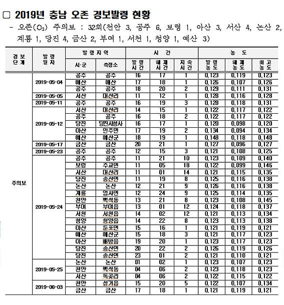 ¿ÃÇØ ¿ÀÁ¸ ÃÖ°í ³óµµ´Â 5¿ù 12ÀÏ ¿¹»êÀ¸·Î, 0.148ppmÀ¸·Î ³ªÅ¸³µ´Ù. Áö¿ªº° ¿ÀÁ¸ÁÖÀǺ¸ ¹ß·É Ƚ¼ö´Â °øÁÖ 6ȸ, ¼»ê 4ȸ, ´çÁø 4ȸ, õ¾È 3ȸ, ¾Æ»ê 3ȸ, ¿¹»ê 3ȸ µîÀÌ´Ù.