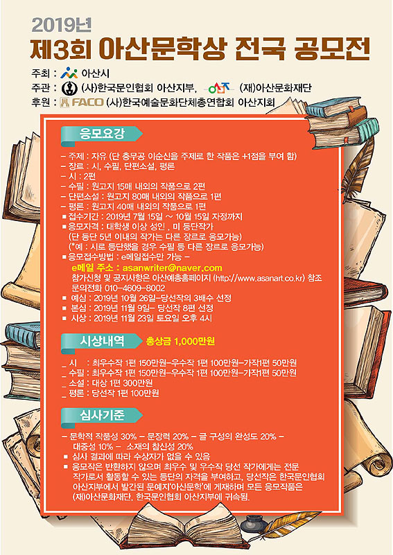 ÀÀ¸ðÀÛǰ Á¢¼ö±â°£Àº 7¿ù 15ÀϺÎÅÍ 10¿ù 15ÀÏ(ÀÚÁ¤)±îÁö 3°³¿ù°£À̸ç e-¸ÞÀÏ(asanwriter@naver.com)·Î¸¸ Á¢¼öÇϰí, ½É»ç´Â ¿¹½É(10¿ù 26ÀÏ, ´ç¼±ÀÛÀÇ 3¹è¼ö)°ú º»½É(11¿ù 9ÀÏ, ÀÔ»óÀÛ 8Æí)À» °ÅÃÄ 11¿ù 23ÀÏ ½Ã»óÇÑ´Ù.