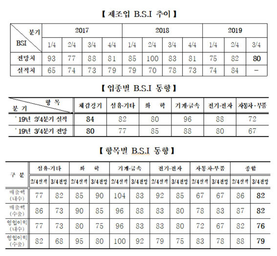 ¾÷Á¾º° BSI Àü¸ÁÀ¸·Î´Â ±â°è¡¤±Ý¼ÓÁ¦Á¶¾÷ 88, ÈÇÐÁ¦Á¶¾÷ 85, Àü±â¡¤ÀüÀÚÁ¦Á¶¾÷ 80, ¼¶À¯ ¹× ±âŸÁ¦Á¶¾÷ 77, ÀÚµ¿Â÷¡¤ºÎǰÁ¦Á¶¾÷ 67 ¼øÀ¸·Î Á¶»çµÆ´Ù.