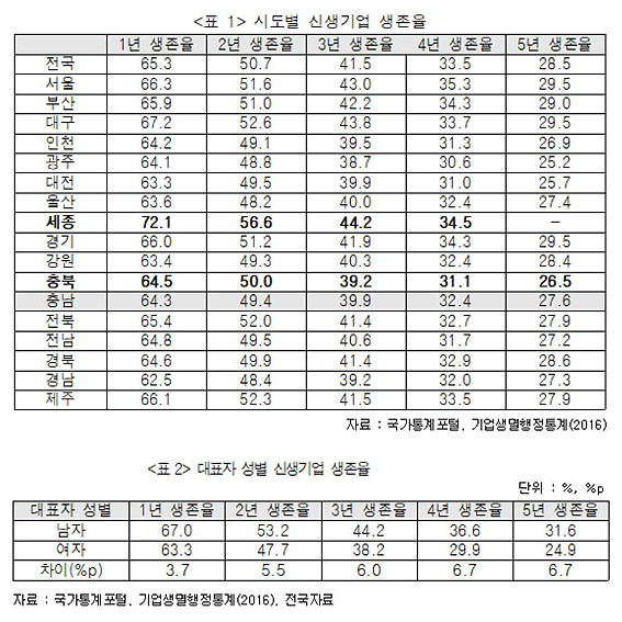 Ãæ³²Áö¿ª ½Å»ý±â¾÷ÀÇ »ýÁ¸À²Àº 1³â 64.3%¿¡¼ 2³â 49.4%·Î 1³âÂ÷¿¡¼ 2³âÂ÷·Î ³Ñ¾î°¡´Â ½Ã±âÀÇ »ýÁ¸À² ³«Â÷°¡ ¸Å¿ì Å©´Ù. ¶ÇÇÑ Àü±¹ÀûÀ¸·Î ¿©¼º CEO ±â¾÷ÀÇ »ýÁ¸À²Àº ³²¼º ±â¾÷ º¸´Ù ª°í ¾÷·ÂÀÌ ±æ¼ö·Ï Â÷ÀÌ´Â Å©°Ô ¹ú¾îÁö´Â »óȲÀÌ´Ù.