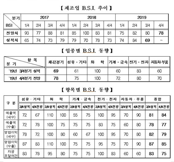 Ãæ³²ºÏºÎ»ó°øÈ¸ÀǼÒ(ȸÀå ÇÑÇü±â)´Â ÃæÃ»±Ç(õ¾È¡¤¾Æ»ê¡¤¿¹»ê¡¤È«¼º) 138°³ Á¦Á¶¾÷ü¸¦ Ç¥º»À¸·Î 2019³â 4/4ºÐ±â Á¦Á¶¾÷ °æ±â½Ç»çÁö¼ö(BSI)¸¦ Á¶»çÇÑ °á°ú, 3/4ºÐ±â ½ÇÀûÀº Áö³ 2ºÐ±â ½ÇÀû 84´ëºñ 15Æ÷ÀÎÆ® Ç϶ôÇÑ ¡®69¡¯ÀÇ Áö¼ö¸¦ ³ªÅ¸³ÂÀ¸¸ç, 4/4ºÐ±â Àü¸ÁÀº ¡®78¡¯·Î Àü ºÐ±â º¸´Ù 2Æ÷ÀÎÆ® Ç϶ôÇß¿´À¸¸ç, 5ºÐ±â ¿¬¼Ó ¡®100¡¯¹Ì¸¸À¸·Î ±â¾÷ÀÇ Ã¼°¨°æ±â´Â À§ÃàµÇ´Â °ÍÀ¸·Î Á¶»ç µÇ¾ú´Ù.