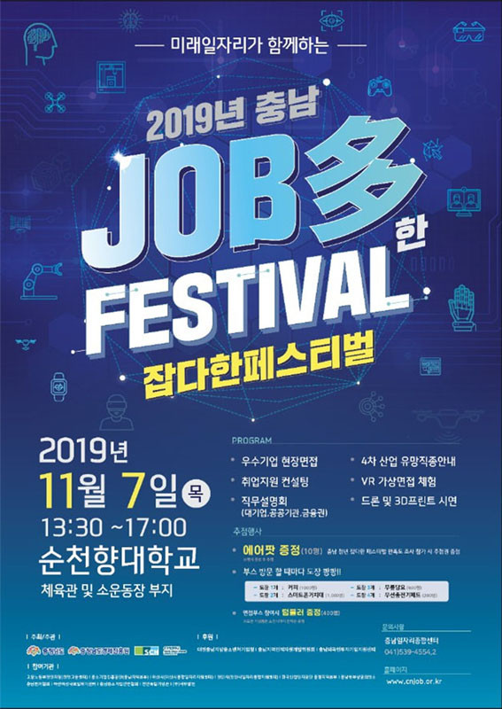 ÃæÃ»³²µµ°¡ ÁÖÃÖÇϰí Ãæ³²°æÁ¦ÁøÈï¿ø(¿øÀå ¿À±¤¿Á)¿¡¼ ¿î¿µÇÏ´Â Ãæ³²ÀÏÀÚ¸®Á¾ÇÕ¼¾ÅͰ¡ ÁÖ°üÇÑ 2019 Ãæ³² û³â Àâ´ÙÇÑ(JobÒý) Æä½ºÆ¼¹úÀÌ(ÀÌÇÏ ¡°Æä½ºÆ¼¹ú¡±) ¿À´Â 11¿ù 7ÀÏ ¿ÀÈÄ 2½ÃºÎÅÍ ¼øÃµÇâ´ëÇб³ üÀ°°ü¿¡¼ °³ÃֵȴÙ.