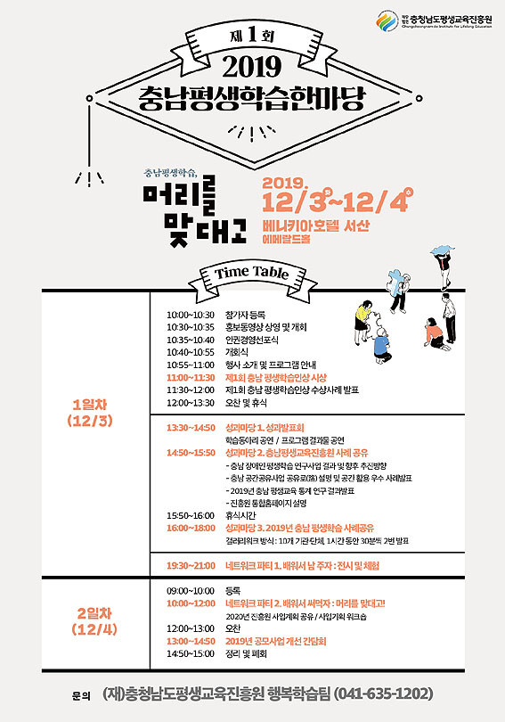 Æò»ýÇнÀ °ü°èÀÚ ¹× ½Çõ°¡ 200¿©¸í°ú ÇÔ²²ÇÏ´Â ÀÌ Çà»ç¿¡¼´Â Á¦1ȸ Ãæ³² Æò»ýÇнÀÀλó(ßÛ) ½Ã»ó ¹× ¼ö»ó»ç·Ê ¹ßÇ¥, ÀÏ ³â °£ÀÇ Æò»ýÇнÀ±â°ü°ú ÇнÀµ¿¾Æ¸® °ø¿¬ ¹× ¼º°ú»ç·Ê °øÀ¯, ÀÚ½ÅÀÇ Àç´ÉÀ» Âü¿©ÀÚµé°ú ÇÔ²² ³ª´©´Â ³×Æ®¿öÅ© ÆÄƼ-¹è¿ö¼ ³²ÁÖÀÚ, 2020³âÀÇ Âü½ÅÇÑ »ç¾÷°èȹÀ» À§ÇÑ ¾ÆÀ̵ð¾î ¹ß±¼ ¹× ±âȹÇÏ´Â ¹è¿ö¼ ½á¸ÔÀÚ-°¡ ¿¸®°í 2019³â ÁøÈï¿ø °ø¸ð»ç¾÷ °³¼± °£´ãȸ°¡ À̾îÁú ¿¹Á¤ÀÌ´Ù.